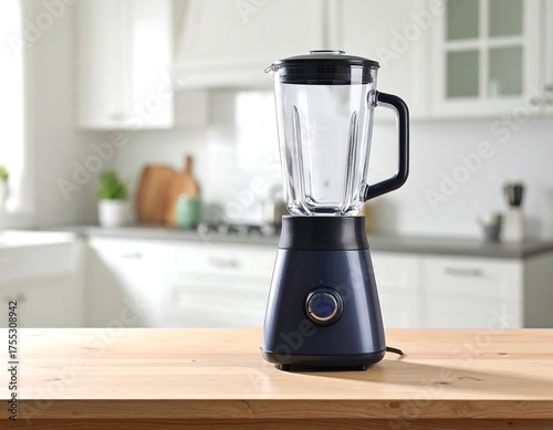 Modern Blender on Wooden Countertop in Bright Kitchen Setting.