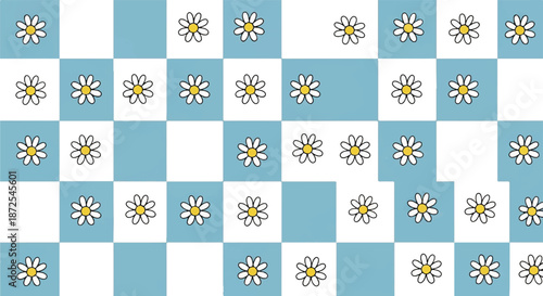 Modern Blue and White Checkered Pattern with Minimalist Daisy Flower Illustrations