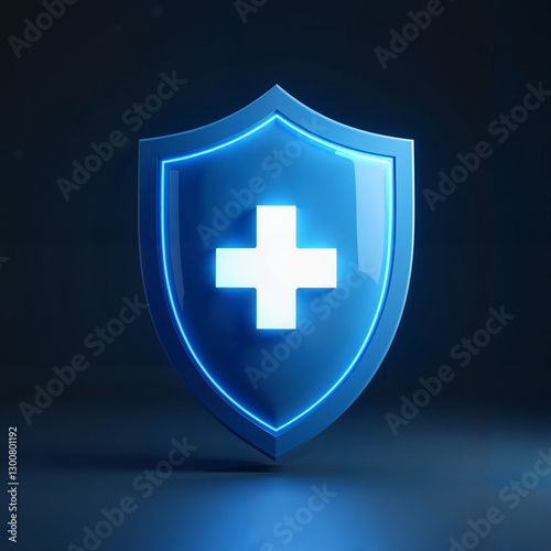 Modern blue shield with a glowing white medical cross in the center, floating on a dark gradient background