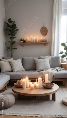 Modern boho interior of living room in cozy apartment. Simple cozy living room interior with light gray sofa, decorative pillows, wooden table with candles and natural decorations