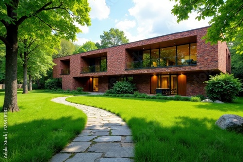 modern architecture, brick house, landscaping, lawn, garden, pathway, paseo, exterior, real estate, property, luxury home, contemporary, elegant, residential, architecture, greengrass, tree, shrub