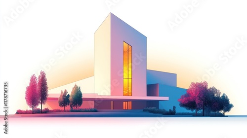 architecture, building, modern, sunset, design, structure, contemporary, urban, city, landscape, exterior, facades, window, light, glasses, tree, plant, dusk, evening, sunrise, illustration, rendering, three-dimensional, model, image, graphic, abstract, style, minimal, geometric, clean, line, shape, colours, vibrant, hue, shadow, perspective, scene, view, concept, visual, artwork, digital, art, space, environment, property