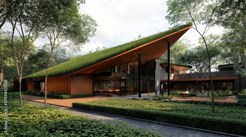 building, modern, design, atmosphere, inviting, nature, tree, landscape, architecture, greenery, sunlight, contemporary, space, environmentally friendly, entrance, relaxation, harmony, lifestyle, retreat, calmness, environment, facades, open, aesthetic, residential, layout, feature, landscaping, patio, garden, light, exterior, setting, roof, sustainable, village, friendly, peaceful, wood, property, innovation, roomy, serene, creative