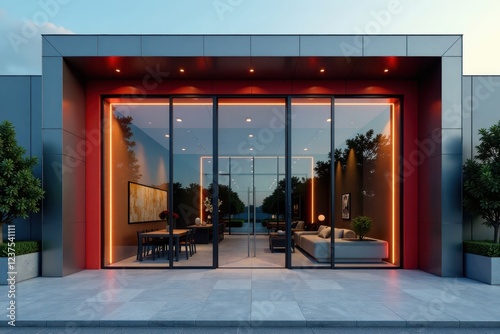 Modern building with large glass doors and sleek metal fa?ade, exterior, urban