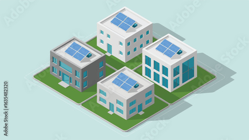 solar panel, isometric, illustration, architecture, renewable energy, green energy, urban, residential, commercial, blue, white, grey, green, window, roof, clean energy, sustainable, technology, design, graphic, vector, city landscape, energy efficiency, power generation, solar energy, modern architecture, digital artwork, graphic design, vivid colors, environmental protection