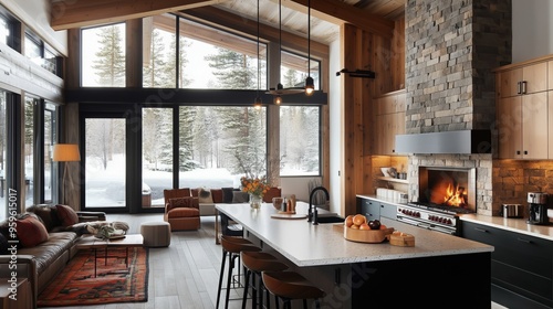Modern cabin kitchen with a stone fireplace and cozy atmosphere.