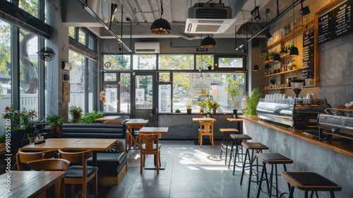 modern cafe interior featuring wooden tables, comfortable seating, and large windows allowing natural light. space is adorned with plants, creating cozy atmosphere for patrons