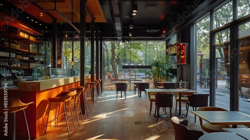 Modern cafe interior with natural lighting and stylish furniture design at dusk