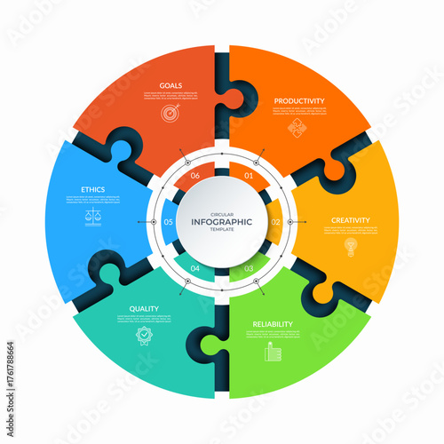 circle, circular, puzzle, infographic, cycle, vector, 6, 6, template, diagram, chart, business, design, banner, presentation, round, information, layout, graph, info, graphic, concept, corporate, marketing, company, modern, element, visualisation, step, strategic, datum, creative, web, process, success, option, overview, booklet, clean, segment, planning