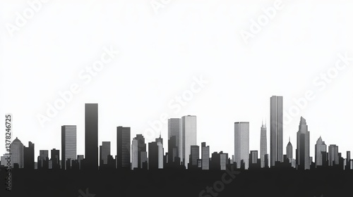 Modern city skyline silhouette at dusk with skyscrapers and high-rise buildings. Urban landscape with futuristic architecture glowing horizon. Metropolitan scenery with business district silhouettes
