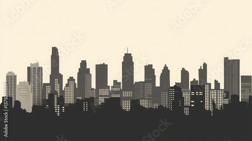 Modern city skyline silhouette at dusk with skyscrapers and high-rise buildings. Urban landscape with futuristic architecture glowing horizon. Metropolitan scenery with business district silhouettes