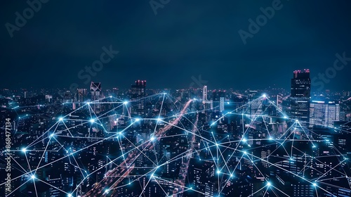 Modern cityscape and communication network concept. Telecommunication. IoT (Internet of Things). ICT (Information communication Technology). 5G. Smart city. Digital transformation.