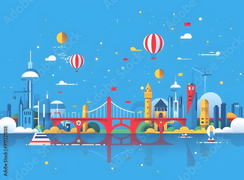 city, bridge, skyline, building, architecture, hot air balloon, illustration, vector, graphic, design, art, urban, modern, futuristic, landscape, water, river, sky, cloud, blue, red, yellow, green, white, geometric, abstract