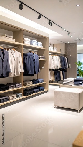 store, clothing, apparel, modern, retail, interior, shelf, display, jacket, suit, fashion, boutique, shop, elegant, clean, bright, lighting, minimalist, arrangement