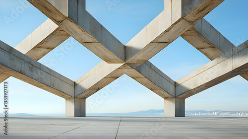 concrete, structure, architecture, building, beam, support, modern, geometric, industrial, light, blue, sky, city, horizon, daylight, exterior, urban, perspective, view, empty, space, design, texture, grey, white, pattern, pillar, framework, city landscape, modern architecture