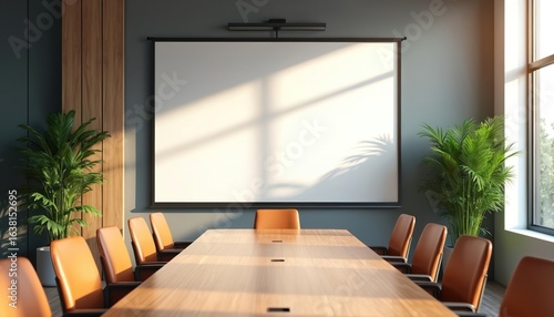 Modern conference room features large blank presentation screen. Sunlight streams through window, casting shadows from green plants onto screen. Includes wooden table, leather chairs, ready for