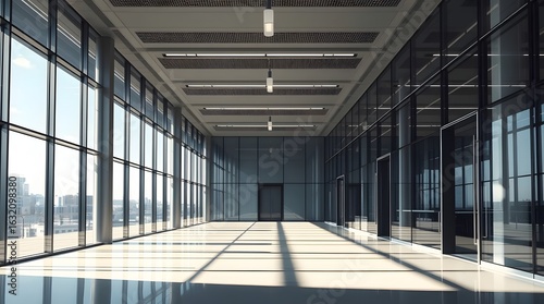 Modern Corporate Office Interior with large glass walls and natural light, minimalist design