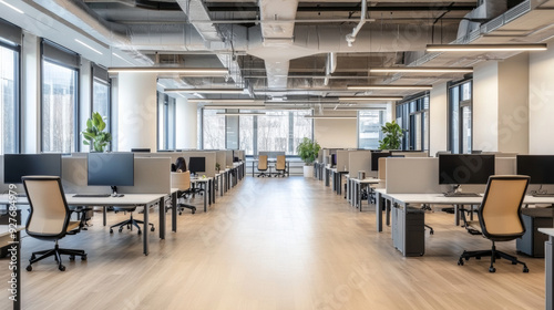 Modern coworking space with white and gray walls, wooden floors, rows of computers and beige chairs. --ar 16:9 --v 6.1 Job ID: 49449bb0-6609-4266-ba15-630ac0d1d3b2
