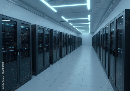 Modern data center featuring rows of server racks illuminated by blue LED lights, showcasing technology