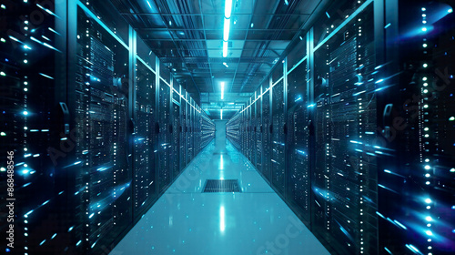 Modern data center operational server racks in rows showcasing cloud computing AI telecommunications and supercomputer technology