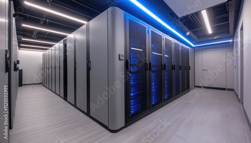 Modern data center server room with rows of network cabinets and blue LED lighting.