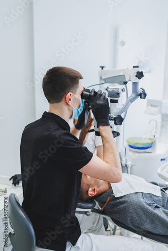 Modern dental office with a microscope. A dentist treats a man's teeth under a microscope, an assistant helps him. Modern medical care for toothache