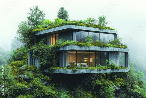 Modern eco-friendly house design blending seamlessly with nature on a hillside