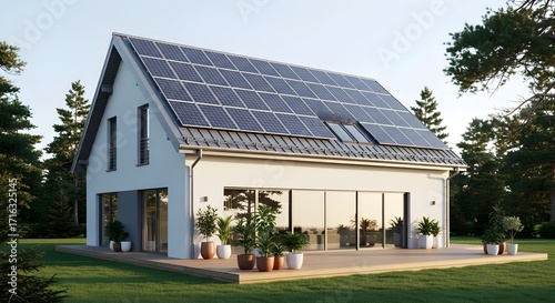 Modern eco-friendly house design with solar panels and lush green surroundings