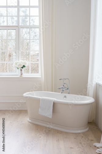 bathroom, bathtub, tub, interior, freestanding, white, minimalist, design, window, bathe, modern, serene, atmosphere, natural, light, towel, curtain, home, decor, relaxation, bathing, elegant, plumbing, luxury, comfort, hygiene, spa, calmness, wellness, soothing, aesthetic, ambience, purity, refreshing, space, simplicity, room, sink, house, apartment, care, domestic, ceramic, background, shower, contemporary, architecture, stylish