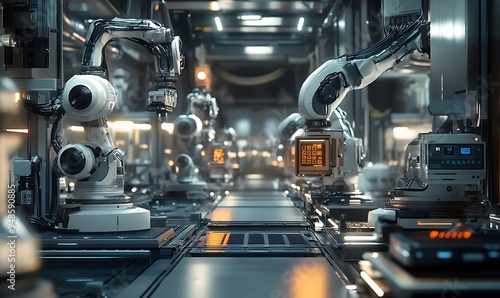 Modern Factory Floor with Robotic Arms and AI-Managed Machinery, Sterile and Precise Environment, Photo Realistic
