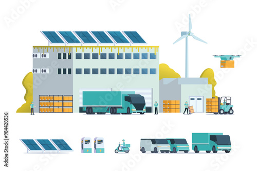 warehouse, logistic, building, illustration, vector, truck, business, green, design, factory, background, delivery, office, infographic, car, city, graphic, energy, sustainable, drone, industry, environment, management, men at work, company, eco, battery, cargo, storage, container, electric, distribution, shipping, transport, logistic, element, forklift, storehouse, solar panel, courier, exterior, garage, trailer, inventory, hub, expedition, clean, friendly