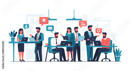 Modern flat illustration of professional business team collaborating in a vibrant office with laptops and communication bubbles.