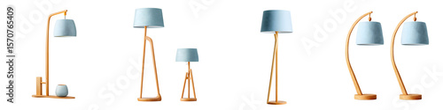 floor lamp, lamp, lighting, interior, design, furniture, modern, contemporary, home, decor, light, room, living room, bedchamber, style, stylish, wood, fabric, blue, white background, isolated, collection, set, minimalist, scandinavian, nordic, comfort, elegance, luxury, ambient, shade, illumination, object, element, illustration, graphic, clip art, arrangement, group