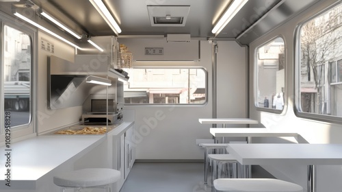 food, truck, interior, modern, stainless, steel, appliance, seating, table, chair, counter, window, city, view, street, light, bright, clean, white, grey, kitchen, countertop, grill, pan, area, dining, space, eatery, design, minimalist, contemporary, commercial, business, catering, service