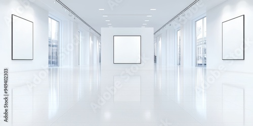 Modern Gallery Interior with Empty Frames White Walls and Tiled Floor