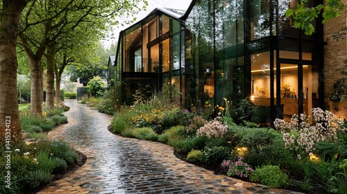 garden, pathway, glasses, house, modern, nature, greenery, flower, architecture, landscape, residential, serene, tree, brick, design, tranquil, colourful, home, environment, spring, summer, aesthetic, sunlight, beauty, plant, vibrant, foliage, urban, relaxation, scenery, peaceful, setting, view, path, season, blossom, bloom, hedge, park, contemporary, sidewalk, leisure, attractive, botanical, space