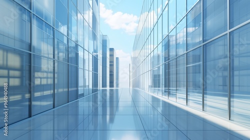Modern Glass Building Corridor in Urban Cityscape with Blue Sky Reflection