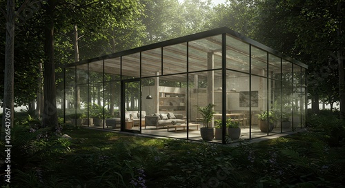 Modern Glass House Surrounded by Forest Trees in a Peaceful Setting