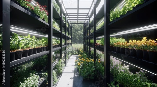 greenhouse, plant, shelf, black, interior, pot, light, garden, modern, urban, vertical, growing, vegetable, flower, herb, foliage, lush, green, nature, design, controlled, environment, lighting, organic, sustainable, agriculture, cultivation, fresh, healthy, food, technology, architecture, space, industrial, contemporary, freshness, cultivated, abundance, growth, system, environmentally friendly, well-being
