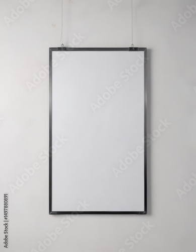 Modern hanging poster mockup, empty frame, white background, metallic clips , home decor, artwork, clean