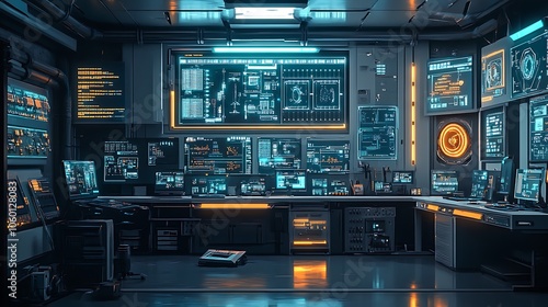Modern high-tech workspace with individual programming a robot with digital circuit and tech interfaces