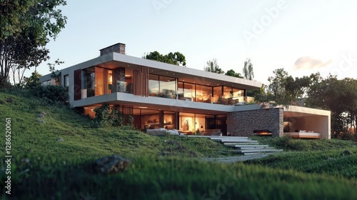 house, modern, architecture, home, design, building, villa, contemporary, residential, real estate, property, estate, luxury, hillside, landscape, exterior, evening, dusk, sunset, view, grass, tree, nature, stone, glasses, window, lighting, illuminated, peaceful, serene, tranquil, elegant, stylish, haven, comfort, luxury home, residence, idylli, roomy