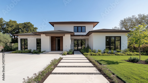 Modern home design with spacious entrance and landscaped garden, showcasing elegance and style