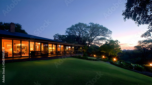 house, night, exterior, building, luxury, home, landscape, architecture, lawn, sky, tree, illuminated, garden, grass, view, evening, blue, scenery, nature, light, residential, modern, estate, calmness, dark, twilight, green, sunset, yard, horizon, backyard, contemporary, calm, structure, property, deck, high-coloured, peaceful, path, balcony, serene, silhouette, scenic, long, glasses, peace