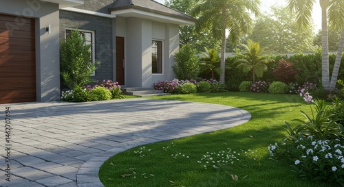 home, exterior, design, driveway, curved, paver, lawn, landscaping, greenery, plant, garden, modern, house, architecture, homeowner, property, improvement, living, stylish, elegant, luxury, beautiful, grass, flower, shrub, tree, sunny, bright, peaceful, serene, relaxing, landscape, residential, yard, front, view, upgrade, aesthetic, attracted