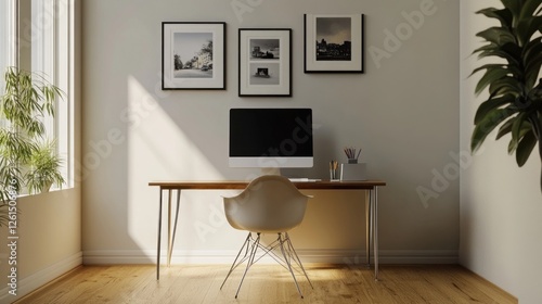 office, home, desk, chair, computer, workspace, modern, minimalism, interior, design, work, room, lighting, decor, style, furniture, white, wood, window, plant, light, sun, shadow, simple, clean, organised, aesthetic, comfortable, stylish, contemporary, bright, cosy, house, table, laptop, monitor, art, picture, frame, minimalist