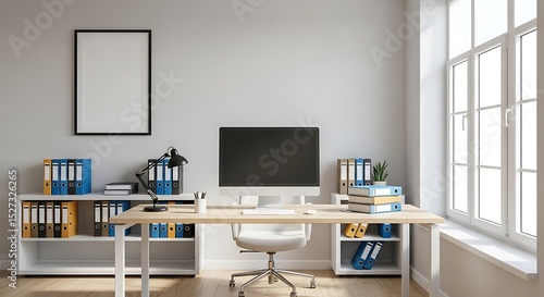 office, workspace, home office, computer, desk, modern, minimalist, design, window, bright, light, shelving, clean, organised, efficient, work, study, productivity, furniture, interior, room, home, decor, style, contemporary, professional, elegant, comfortable, functional, aesthetic, architecture, interior design, workplace, business, technology, equipment, file, folder, storage, plant, simple, neat, white, wooden, setup, arrangement, indoor, keyboard, monitor