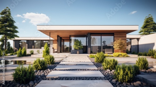 modern, home, architecture, house, exterior, design, residential, contemporary, pathway, stone, pool, water, landscape, garden, front, door, window, wood, sky, blue, sun, bright, natural, green, plant, grass, tree, concrete, grey, minimalist, luxury, elegant, style, geometric, clean, line, simple, peaceful, tranquil