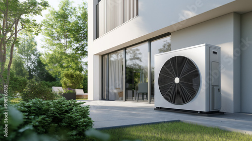 Modern home with external HVAC unit, energy-efficient climate control
