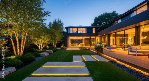 backyard, landscape design, architecture, residential, exterior, dusk, evening, lighting, garden, lawn, patio, deck, paseo, stone, tree, bush, contemporary, luxury, real estate, property, home, house, design, architectural, landscaping, modern architecture